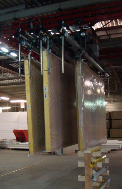 La solution de manutention choisie, a été un convoyeur aérien birail BM6 automatique avec des balancelles spéciales permettant un mouvement vertical sur toute la longueur des postes de travail et sur les deux postes de chargement et déchargement.